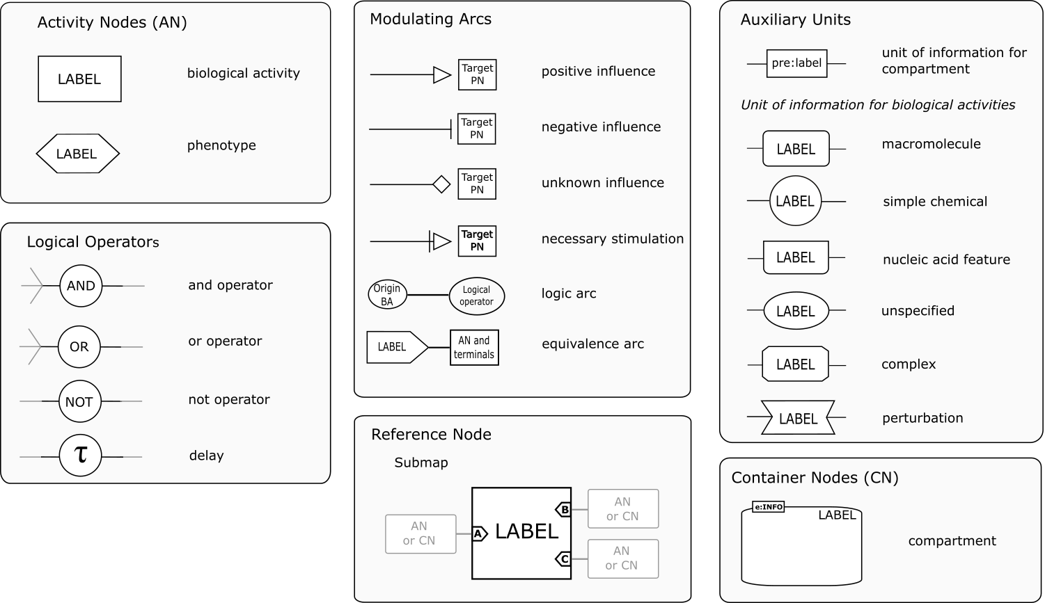 Mi H., Schreiber F., Moodie S., Czauderna T., Demir E., Haw R., Luna A., Le Novère N., Sorokin A., Villéger A.Systems Biology Graphical Notation: Activity Flow language Level 1 Version 1.2.Journal of Integrative Bioinformatics(2015) 12(2): 266