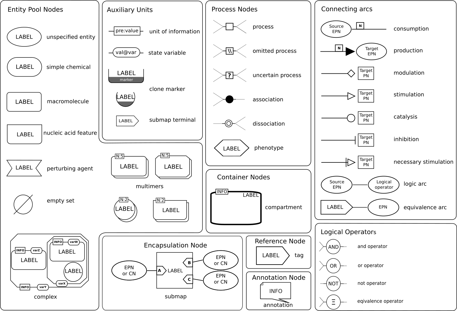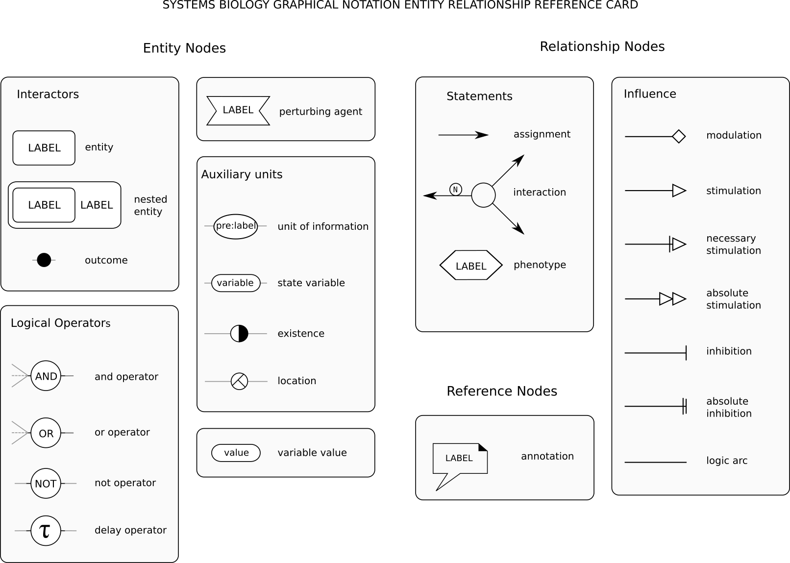 Le Novère N., Hucka M., Mi H., Moodie S., Shreiber F., Sorokin A., Demir E., Wegner K., Aladjem M., Wimalaratne S., Bergman F.T., Gauges R., Ghazal P., Kawaji H., Li L., Matsuoka Y., Villéger A., Boyd S.E., Calzone L., Courtot M., Dogrusoz U., Freeman T., Funahashi A., Ghosh S., Jouraku A., Kim S., Kolpakov F., Luna A., Sahle S., Schmidt E., Watterson S., Goryanin I., Kell D.B., Sander C., Sauro H., Snoep J.L., Kohn K., Kitano H. The Systems Biology Graphical Notation.Nature Biotechnology(2009), 27: 735-741The Systems Biology Graphical Notation. Nature Biotechnology (2009), 27: 735-741.